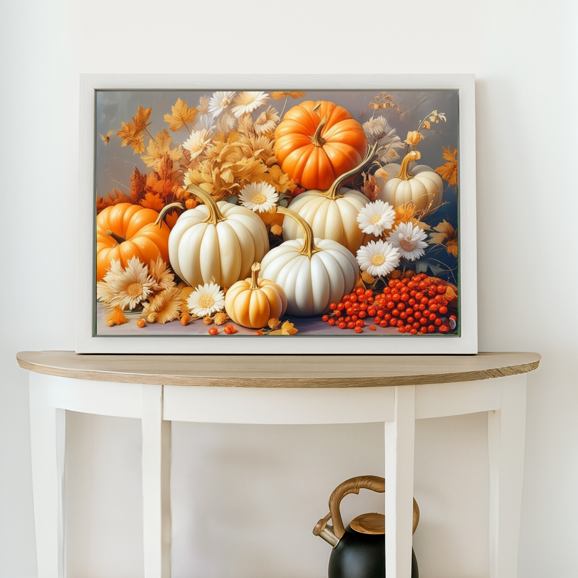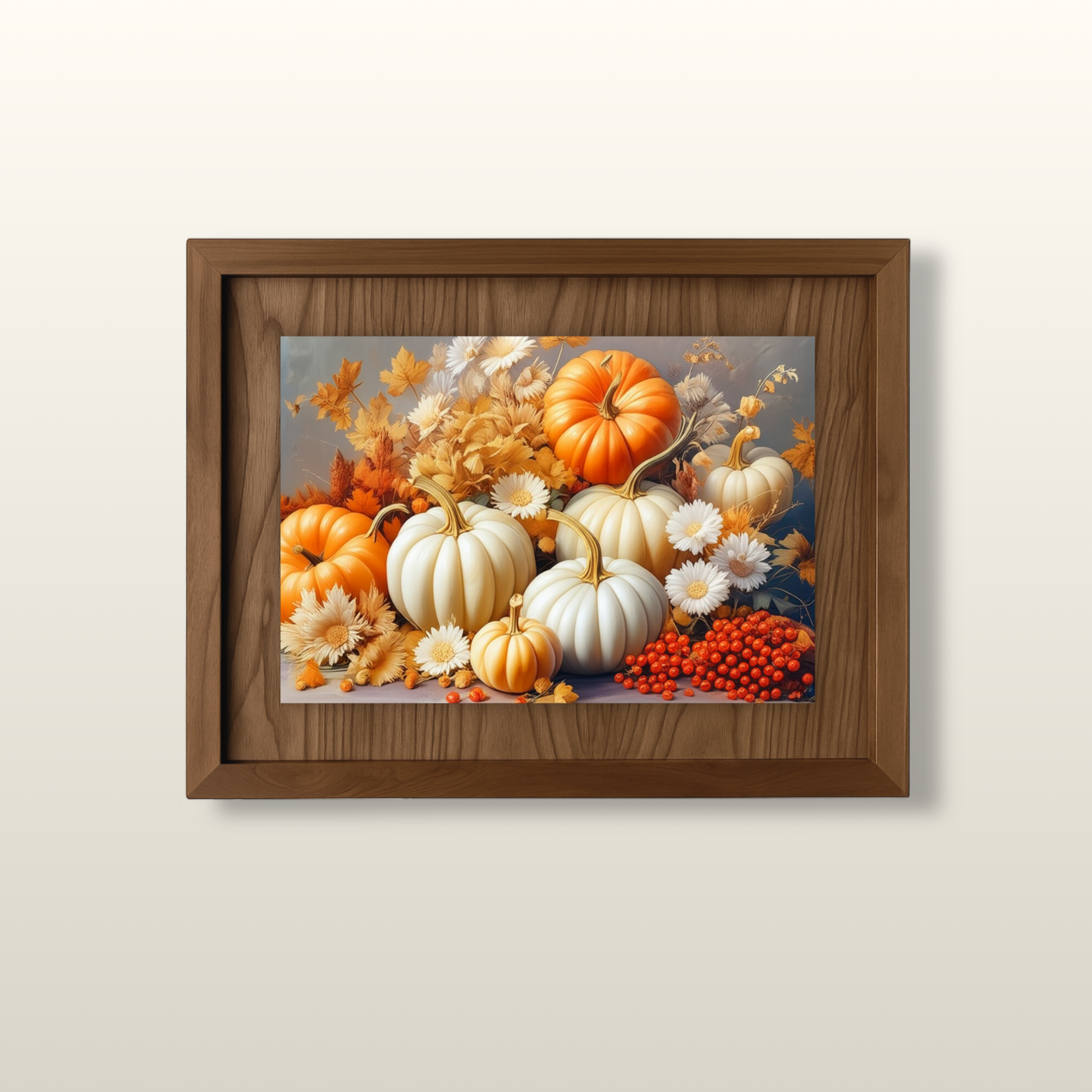 The print showcases a delightful collection of pumpkins—both classic orange and elegant white—tucked among fall foliage in shades of gold and amber. Delicate white daisies and clusters of bright red berries complete the arrangement, creating a perfect balance of texture and color.