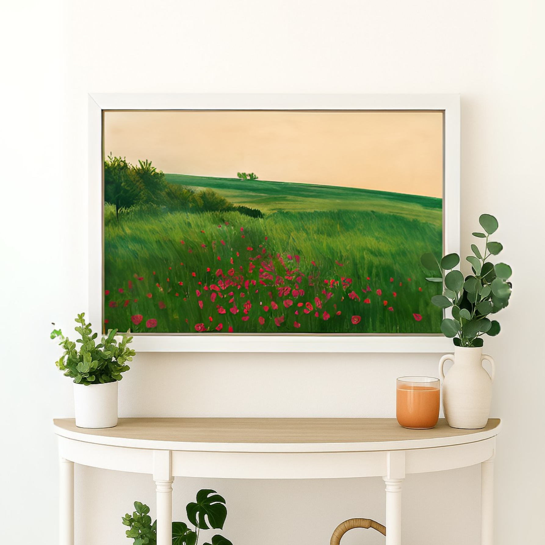 Imagine effortlessly refreshing your walls with captivating wall art that suits every mood and season! This stunning canvas print, titled "Golden Hour Meadow," features a serene countryside scene with gentle hills, warm sky tones, and a field of soft wildflowers – a peaceful moment captured in time. It's more than just a beautiful image – it's your gateway to a dynamic and ever-evolving home decor experience. Designed specifically for our innovative magnetic wood frame system, this gallery-quality canvas allows you to swap artwork in seconds, bringing a touch of modern convenience to timeless elegance. You won't find a better selection at any prints shop!
